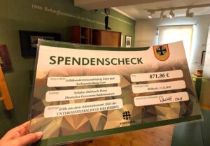Im Anschluss schenkten der Delitzscher Oberbürgermeister Dr. Manfred Wilde und der USH-Schulkommandeur Oberst Andreas Schnebelt Glühwein für den guten Zweck aus. Die Einnahmen kamen zu gleichen Teilen der Deutschen Hermann-Schulze-Delitzsch-Gesellschaft e. V. und dem Soldatenhilfswerk zugute. Unsere Gesellschaft erhielt 871,86 Euro.